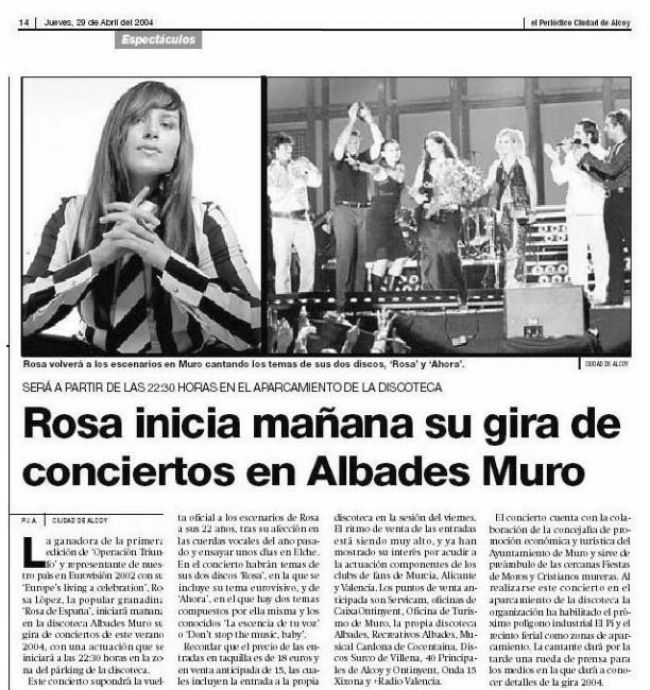Rosa inicia mañana su gira de conciertos en Abades MuroCiudad de Alcoy29/04/2004Escaneada por Desconocido