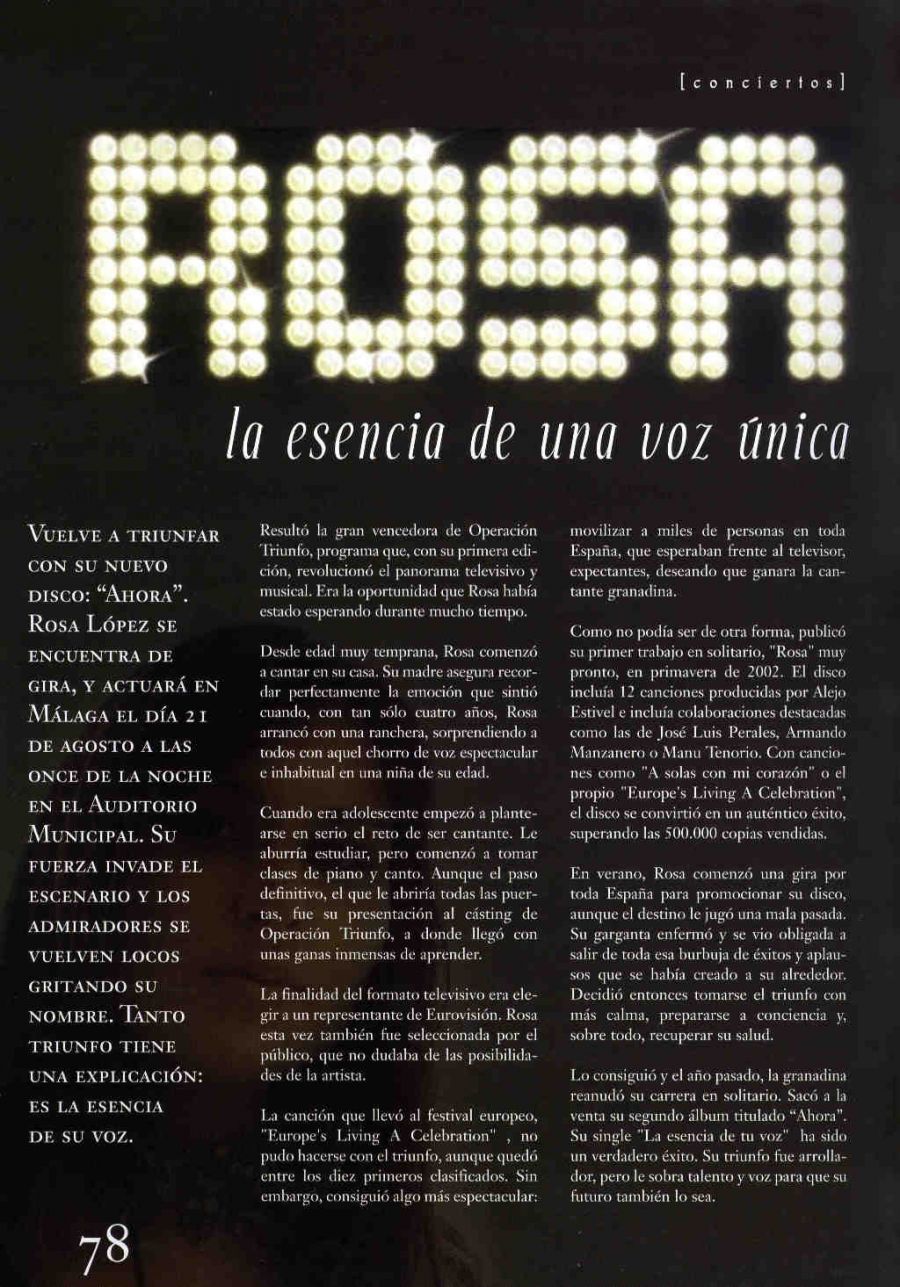 Rosa, la esencia de una voz únicaFeria de Málaga01/08/2004Escaneada por Rosamania